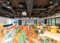 日比谷公園が見下ろせる眺望の8ABC+LOUNGE Northは遊び心のある空間設計。ヘリンボーンフローリングに壁面アート、カラフルな椅子は来場されるゲストの気分を盛り上げ、イベントの魅力を引き立てます。一方、LOUNGE South側の8D / 8E / 8Fはフォーマルデザインの落ち着いた雰囲気。キャスター付きの椅子は利便性が高く、使い心地がよいと好評です。例えばフォーマルな会場で経営方針発表会を行った後、カジュアルデザインの8ABC+LOUNGE Northでパーティと、同フロアにありながらメリハリの効いた演出が可能になります。