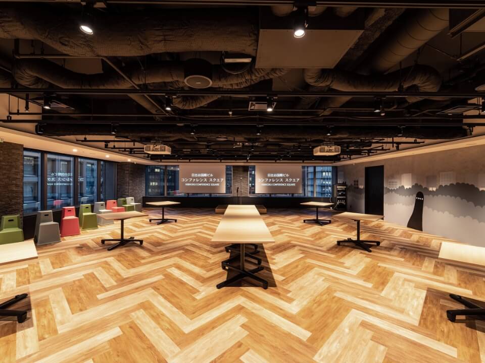 2面スクリーン、高解像度のプロジェクターを採用した、セミナーや製品発表会などにおすすめの空間です。遊び心のある空間設計で、活発な意見交換が必要なイベントにも適しています。ラウンジの利用も可能ですのでゲストや参加者のおもてなしの質も高まります。