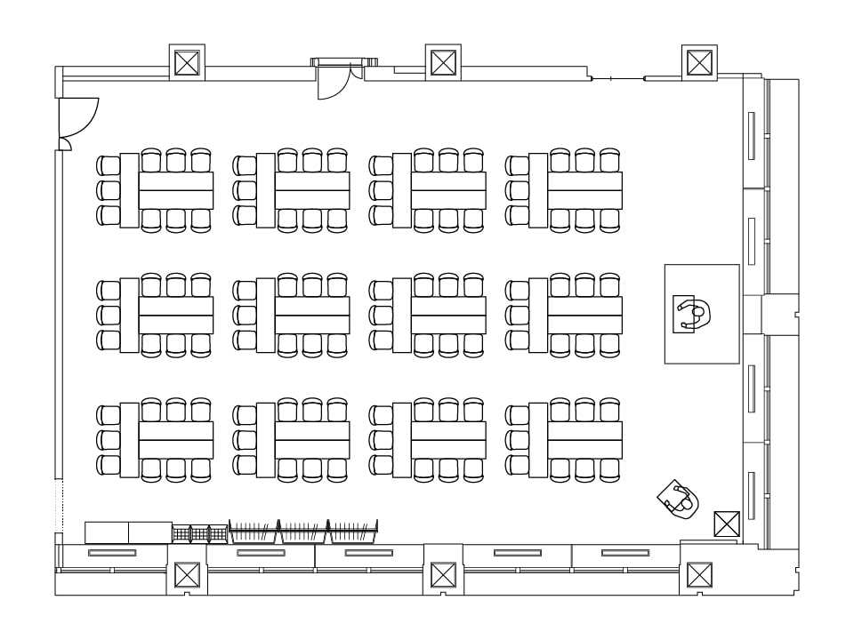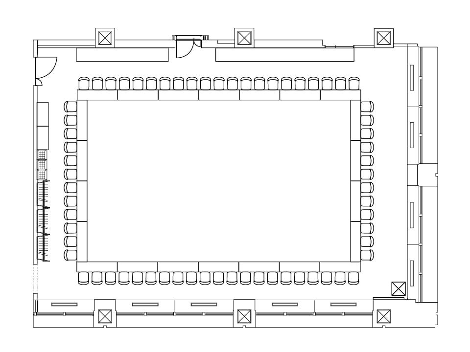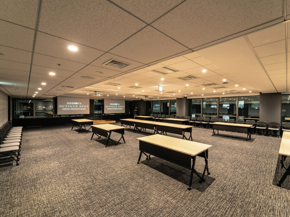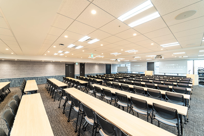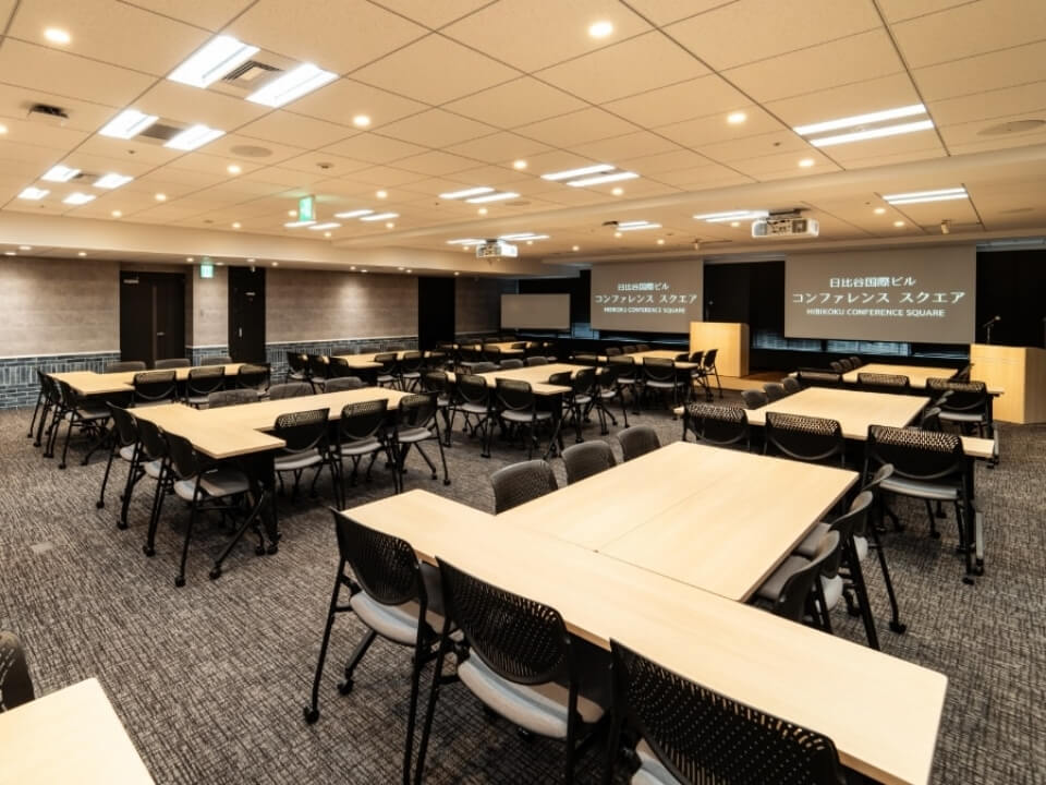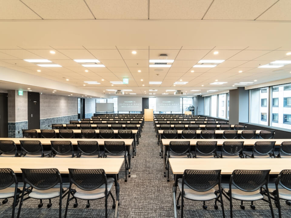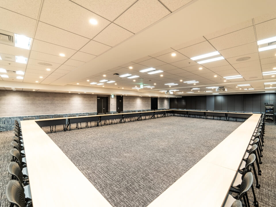 120人規模のイベントに最適な、レイアウトも自由に変更できる使い勝手のよい部屋です。国際会議や社員総会などフォーマルな用途はもちろん、夜の懇親会の利用にも適しています。マイクや演台、司会台など無料備品が充実しています。